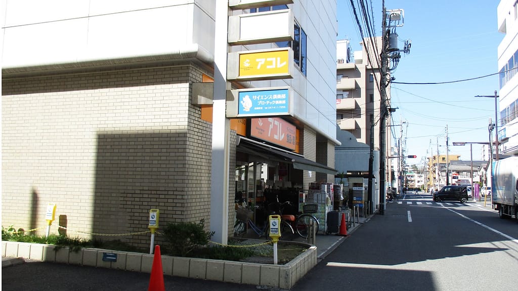 船橋駅北口前のロータリーの右側を直進する。左手側に道をはさみイトーヨーカドーが見え、歩道橋があるT字路で左に曲がる。イトーヨーカドーを背にして道なりに進み、レンガ状の外壁ビル「ベルヴィル船橋本町」の角を左折し道なりに進んだ右手側。1階はスーパー「アコレ」。