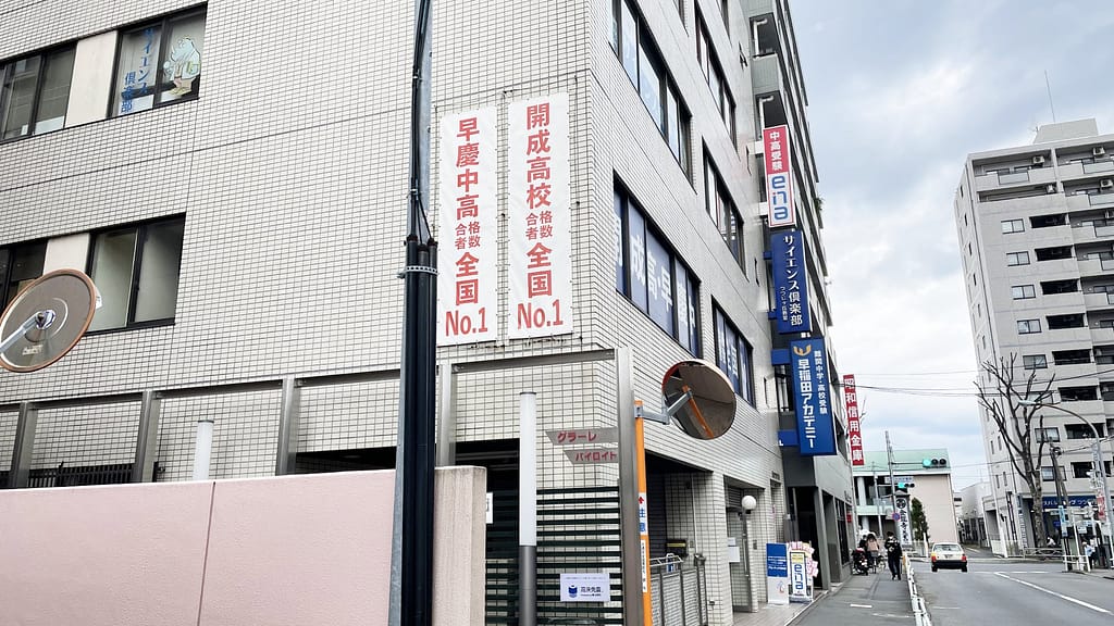 つつじヶ丘駅北口改札を出て、ロータリーを抜けて正面道路を直進し、左手にある早稲田アカデミーの上3階。